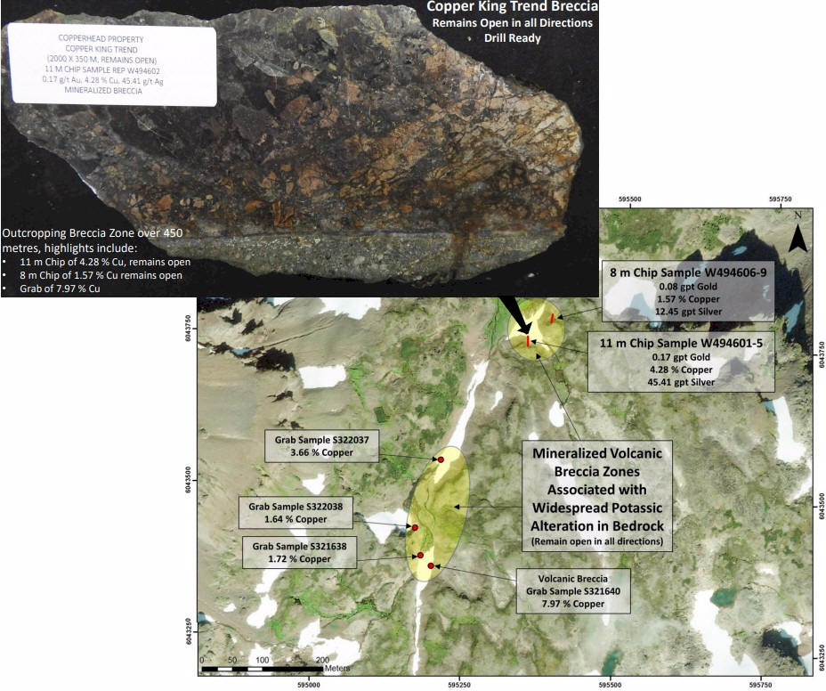 started and ended in mineralization that remains open. Drill ready target at location of 8 metre chip sample from breccia that returned 0.08 g/t Au, 1.57 % Cu, and 12.45 g/t Ag. The chip sample started and ended in mineralization that remains open.